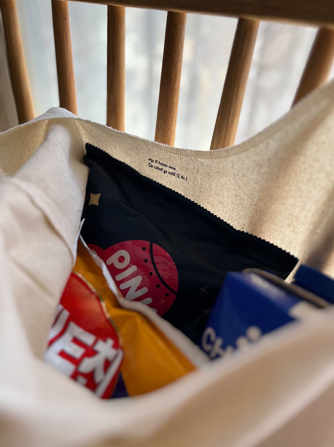 お買い物袋としてはもちろん、カジュアルならメインバッグにもできるサイズでありながら、平たくたたんでコンパクトに持ち歩けます。